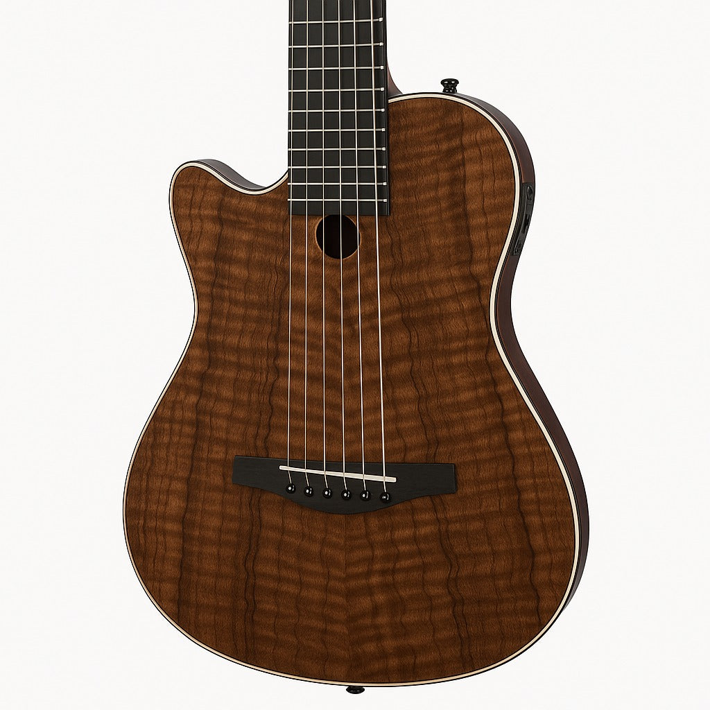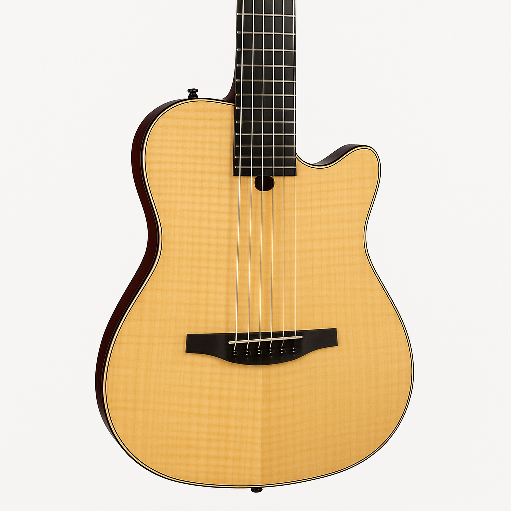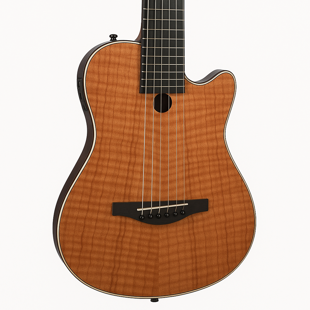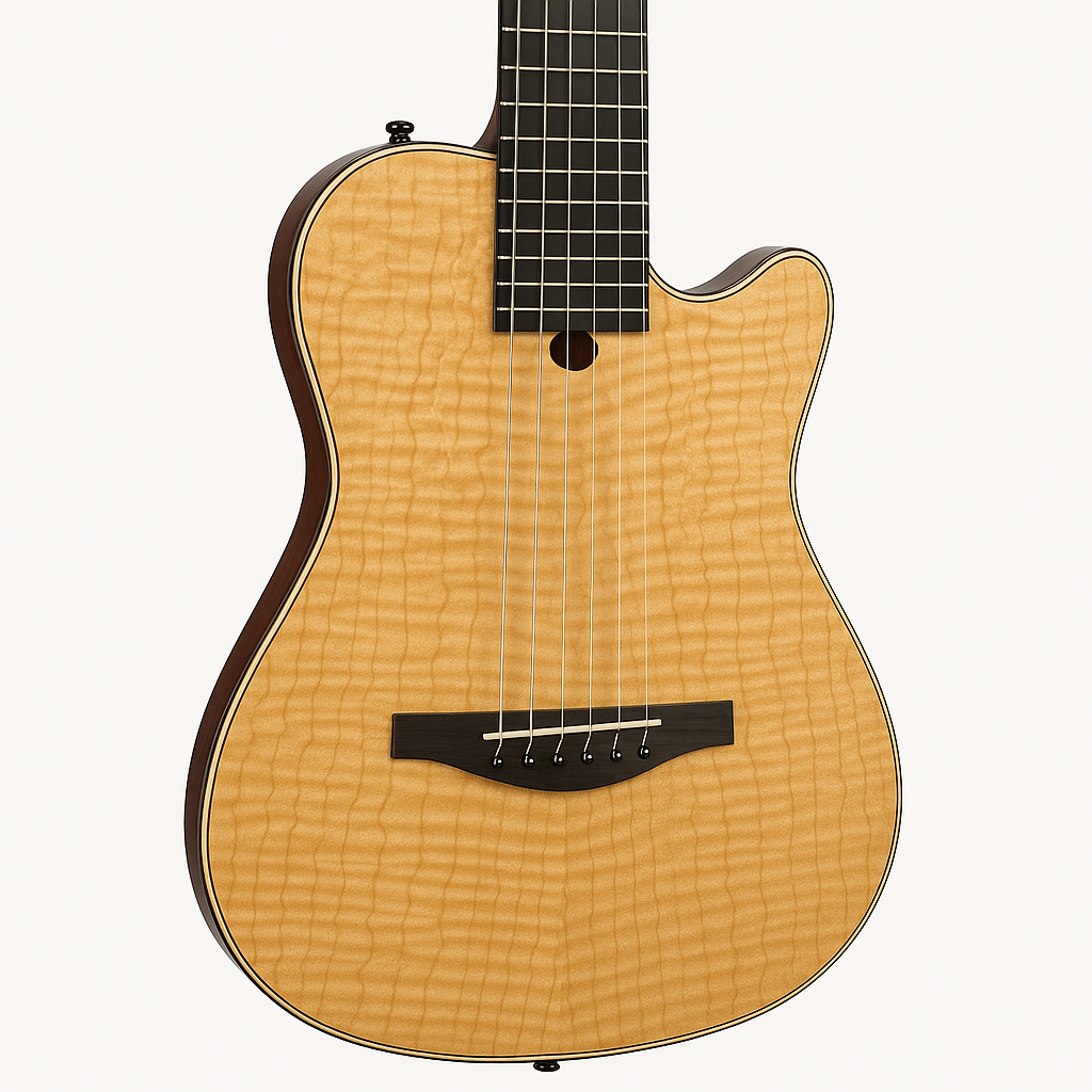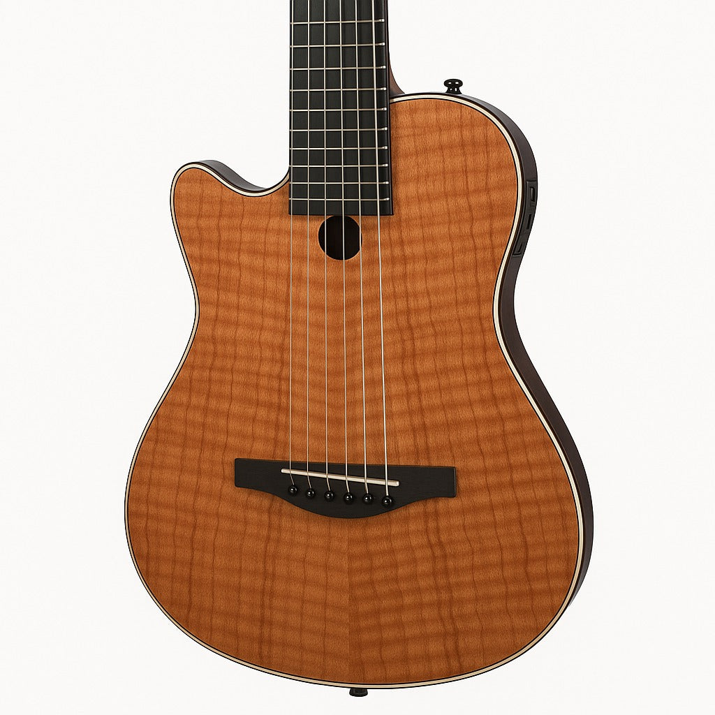 Choose your stage presence with a stunning quilted or flamed top in maple, walnut, or cedar, finished naturally or in rich bursts that accentuate every ripple of the wood. Beneath your fingertips, a silky ebony fingerboard on a resonant mahogany neck (25½″ scale, stainless-steel frets) delivers glassy trebles, warm mids, and tight lows.